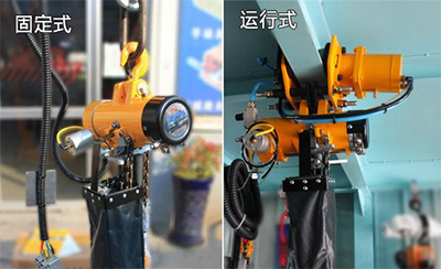 氣動(dòng)葫蘆有兩種運(yùn)行方式,固定式和運(yùn)行式,固定式帶有掛鉤固定某一處來工作;而運(yùn)行式是搭配運(yùn)行小車,安裝軌道實(shí)現(xiàn)滑動(dòng)工作。